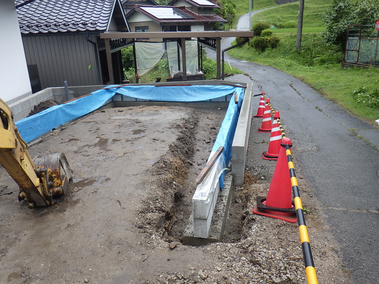 ガレージの基礎工までが終わっているので、あとは基礎工周りの埋戻しと、ガレージの組立設置です。